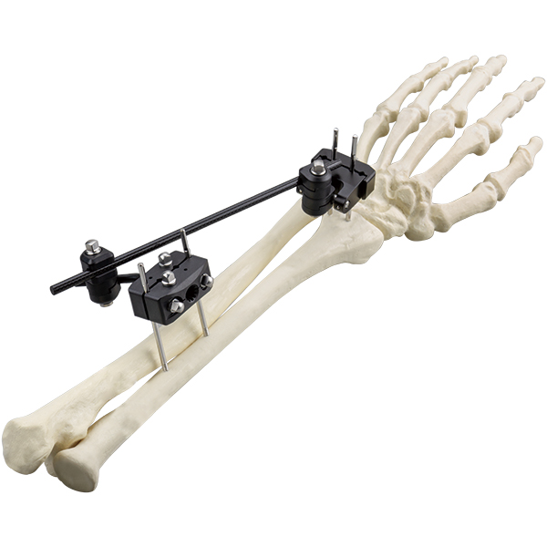In the parallel layout, put two 3mm bone screws in the radius shaft at the proximal end, and put two 3mm bone screws in the distal dorsal nodules. Mount the coupling X proximally and connect it with a straight post. Install a Coupling XI at the far end. Then use two rod to rod couplings VII and one Ф5 L180mm connecting rod (straight type) to connect all the components into a frame and finally lock. (In the operation, the needle block X and the needle block XIX should be used as guide for the parallel layout of the Bone screws) .
